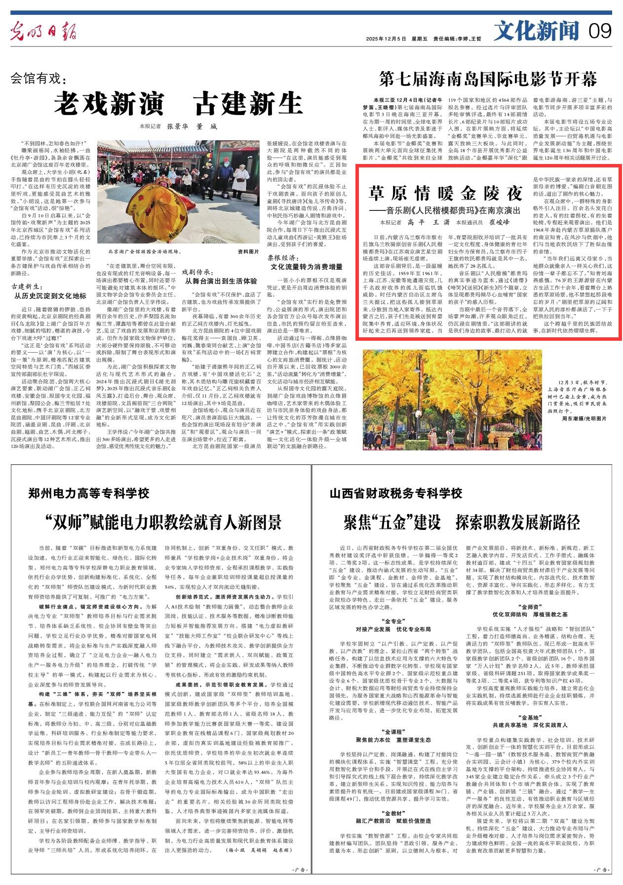 2025年12月5日《光明日?qǐng)?bào)》第9版刊發(fā)了《原情暖金陵夜——音樂劇《人民楷模都貴瑪》在南京演出》的文章,報(bào)道了日前,內(nèi)蒙古烏蘭察布市察右后旗烏蘭牧騎原創(chuàng)音樂劇《人民楷模都貴瑪》在江蘇南京演藝星空劇場(chǎng)連續(xù)上演,現(xiàn)場(chǎng)座無(wú)虛席。這個(gè)跨越千里的民族團(tuán)結(jié)故事,在新時(shí)代依然熠熠生輝。