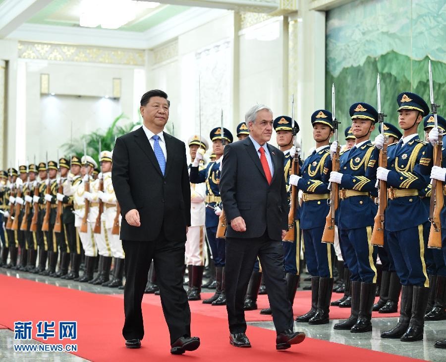 4月24日,國家主席習近平在北京人民大會堂同智利總統(tǒng)皮涅拉舉行會談。這是會談前,習近平在人民大會堂北大廳為皮涅拉舉行歡迎儀式。 新華社記者 饒愛民 攝