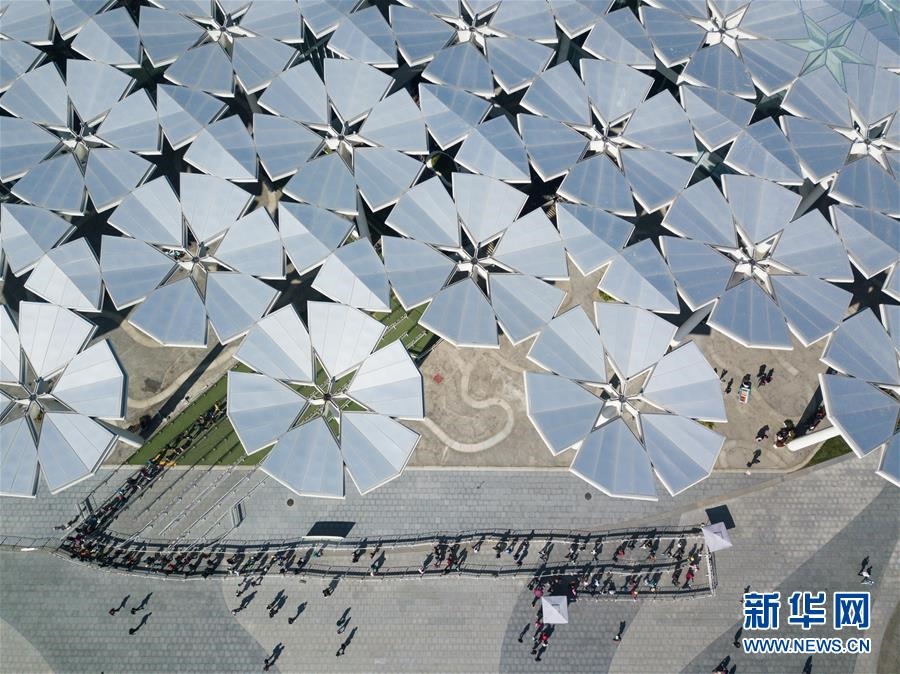 游客在北京世園會(huì)國(guó)際館前排隊(duì)參觀(10月7日無人機(jī)拍攝)。