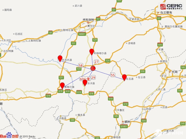 震中距和林格爾縣27公里、距清水河縣29公里、距山西右玉縣55公里、距托克托縣58公里、距準(zhǔn)格爾旗60公里,距呼和浩特市76公里?! ?/p>