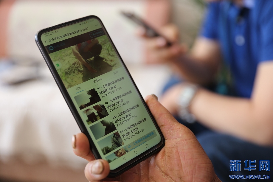6月10日,內(nèi)蒙古自治區(qū)烏審旗無定河鎮(zhèn)農(nóng)業(yè)“土專家”在玉米地里針對小地老虎病蟲害問題,進行線上直播,向當(dāng)?shù)剞r(nóng)民講解防治方法。新華網(wǎng)曹楨攝