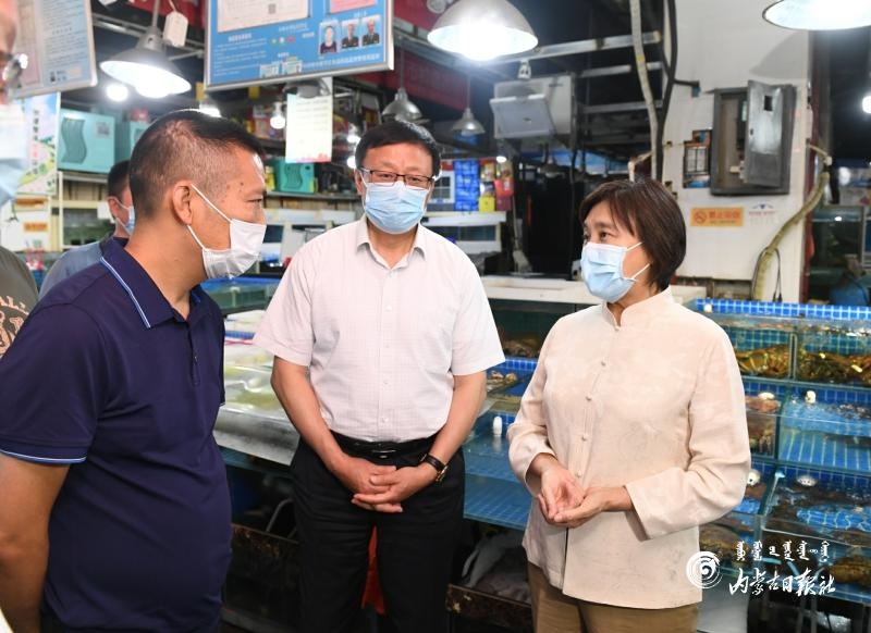 6月22日,自治區(qū)黨委副書記、自治區(qū)主席、自治區(qū)新冠肺炎疫情防控工作指揮部總指揮布小林,自治區(qū)副主席、自治區(qū)防控工作指揮部副總指揮歐陽曉暉來到位于呼和浩特市賽罕區(qū)的融橋海鮮市場,了解海鮮和水產(chǎn)品產(chǎn)地、物流運輸、銷量變化等情況。內(nèi)蒙古日報社融媒體記者 韓卿立 攝