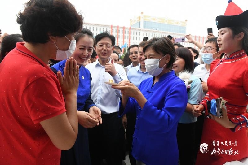 布小林認真觀看精品旅游線路和重點景區(qū)、民族手工藝品、特色文創(chuàng)旅游商品、非物質(zhì)文化遺產(chǎn)、傳統(tǒng)技藝制作以及傳統(tǒng)蒙古包展示,了解文旅科技發(fā)展,并與相關(guān)人員交流商品的創(chuàng)意設計、制作工藝、市場銷售等情況,鼓勵他們保護傳承好民族手工藝、非物質(zhì)文化遺產(chǎn)和傳統(tǒng)技藝,注重將傳統(tǒng)工藝與現(xiàn)代技藝結(jié)合起來,與現(xiàn)實生活和時尚需求結(jié)合起來,使其具有更旺盛的生命力和更廣闊的市場。在內(nèi)蒙古味道展示區(qū),布小林仔細詢問特色美食的制作和食材來源,并向現(xiàn)場群眾介紹內(nèi)蒙古農(nóng)畜產(chǎn)品。她說:“內(nèi)蒙古的農(nóng)畜產(chǎn)品是有機、綠色的,大家可以放心吃?!?/p>