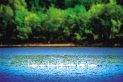 內(nèi)蒙古大興安嶺保存完整的生態(tài)系統(tǒng),為保護生物多樣性提供了基礎(chǔ)。圖為一群大天鵝遷徙途中落腳大興安嶺天然湖泊。