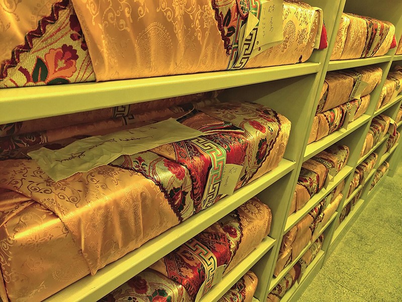 走入蒙古文古籍庫,上萬件古籍靜靜地擺放著,在昏黃的特殊燈光照射下,一排排書架金光閃閃,一個個防磁柜就像知識的巨人并肩站立,歷史在這里塵封,也在這里開啟。