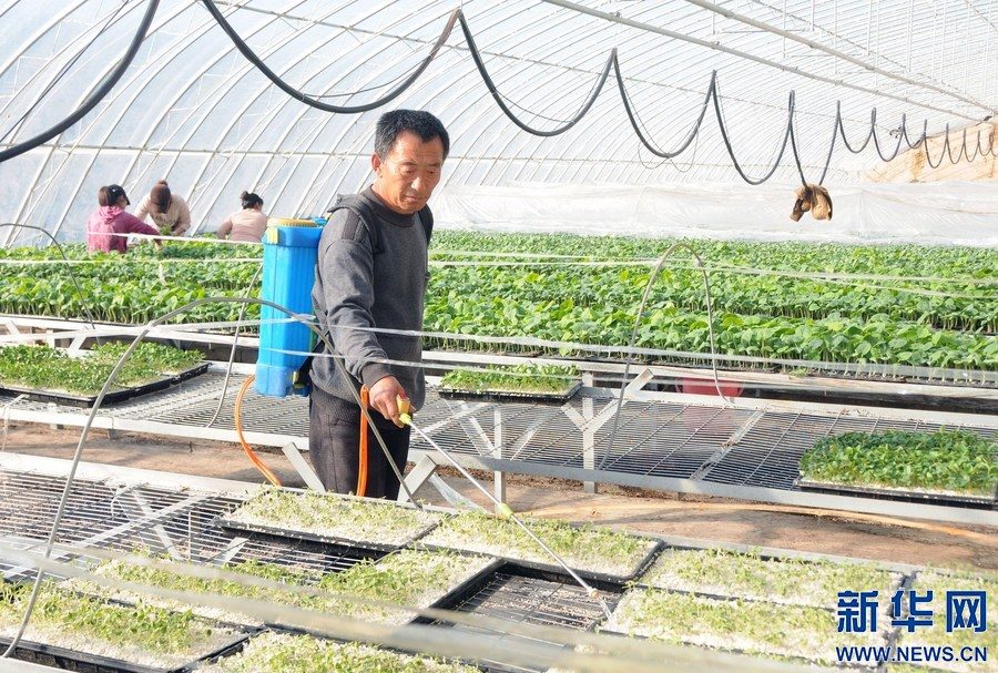 工作人員在內(nèi)蒙古自治區(qū)巴彥淖爾市五原縣現(xiàn)代農(nóng)業(yè)科技示范園日光溫室大棚內(nèi)育苗。新華社記者 李云平 攝