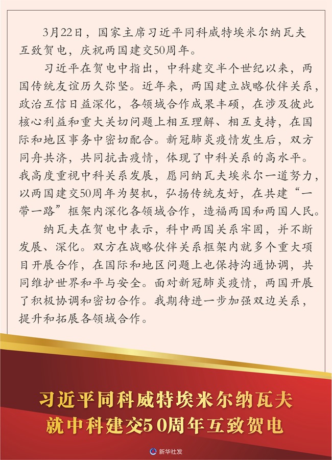 習(xí)近平在賀電中指出,中科建交半個世紀(jì)以來,兩國傳統(tǒng)友誼歷久彌堅。近年來,兩國建立戰(zhàn)略伙伴關(guān)系,政治互信日益深化,各領(lǐng)域合作成果豐碩,在涉及彼此核心利益和重大關(guān)切問題上相互理解、相互支持,在國際和地區(qū)事務(wù)中密切配合。新冠肺炎疫情發(fā)生后,雙方同舟共濟(jì),共同抗擊疫情,體現(xiàn)了中科關(guān)系的高水平。我高度重視中科關(guān)系發(fā)展,愿同納瓦夫埃米爾一道努力,以兩國建交50周年為契機(jī),弘揚傳統(tǒng)友好,在共建“一帶一路”框架內(nèi)深化各領(lǐng)域合作,造福兩國和兩國人民。