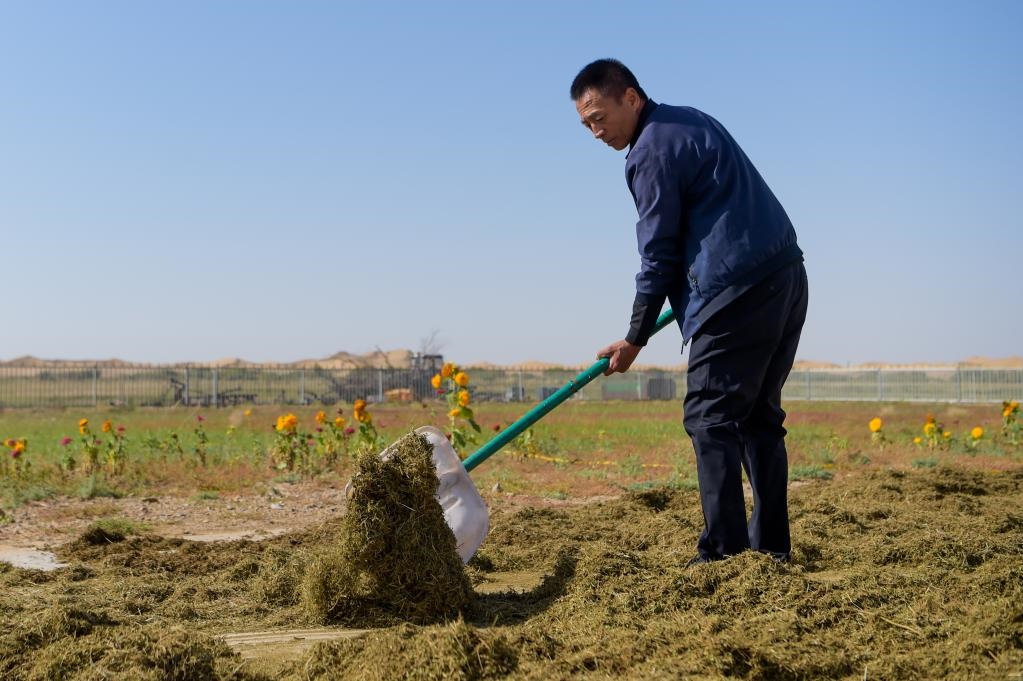 秋天的庫布其,午后的陽光照在金色沙丘上。在鄂爾多斯市達拉特旗光伏發(fā)電應用領跑基地的一片光伏板旁,馬天景和往常一樣,查看著試驗田里的牧草幼苗。