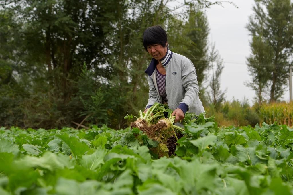 9月26日,達拉特旗五股地村村民陳玉蓮在菜地勞作。新華社記者 李志鵬攝