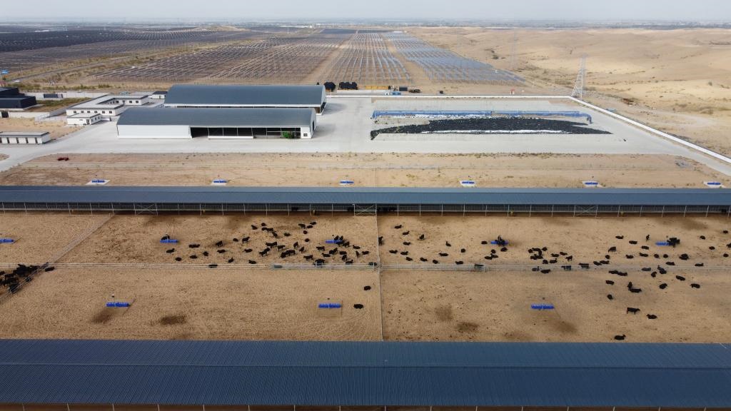 “這是我們在光伏基地打造的循環(huán)經(jīng)濟項目?!敝行罂萍加邢薰救馀藴驶B(yǎng)殖場負責人石龍說,養(yǎng)殖場肉牛產(chǎn)生的糞便可以作為光伏基地板間種植作物的肥料,改善沙地土質的同時還能促進作物生長,而這些作物又能作為飼料供應養(yǎng)殖場,循環(huán)發(fā)展的同時還能促進沙漠生態(tài)改善。