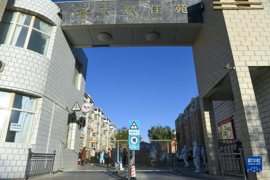這是10月20日拍攝的因疫情封控的阿拉善盟額濟(jì)納旗達(dá)來(lái)呼布鎮(zhèn)天賦佳苑小區(qū)。新華社記者 貝赫 攝