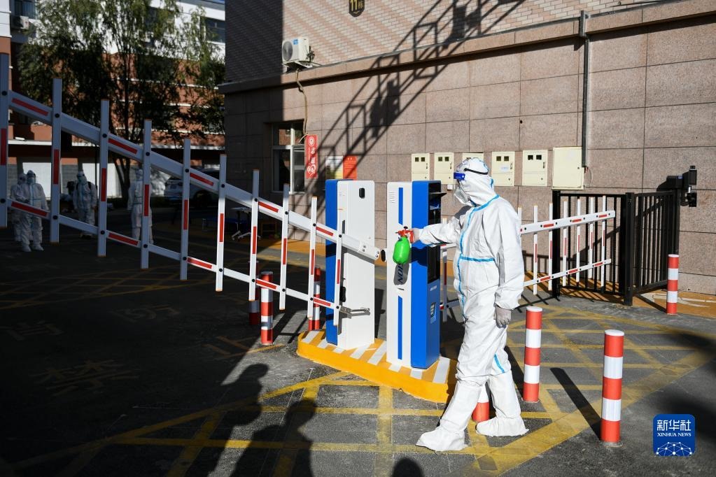 10月20日,在因疫情封控的阿拉善盟額濟(jì)納旗達(dá)來(lái)呼布鎮(zhèn)團(tuán)結(jié)小區(qū)內(nèi),社區(qū)工作人員進(jìn)行消殺工作。