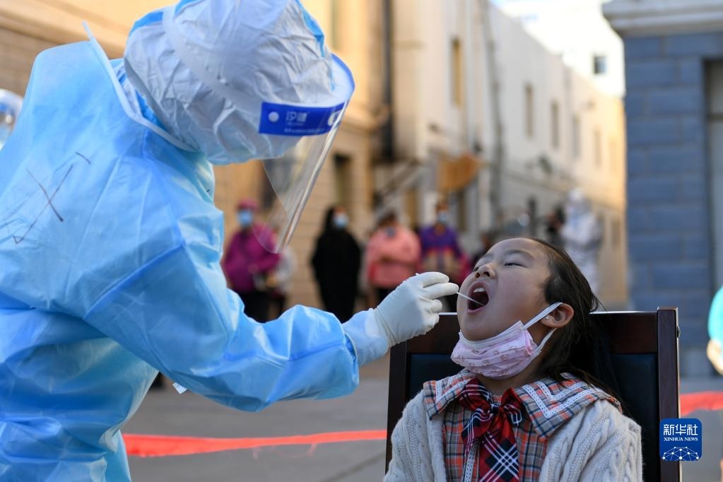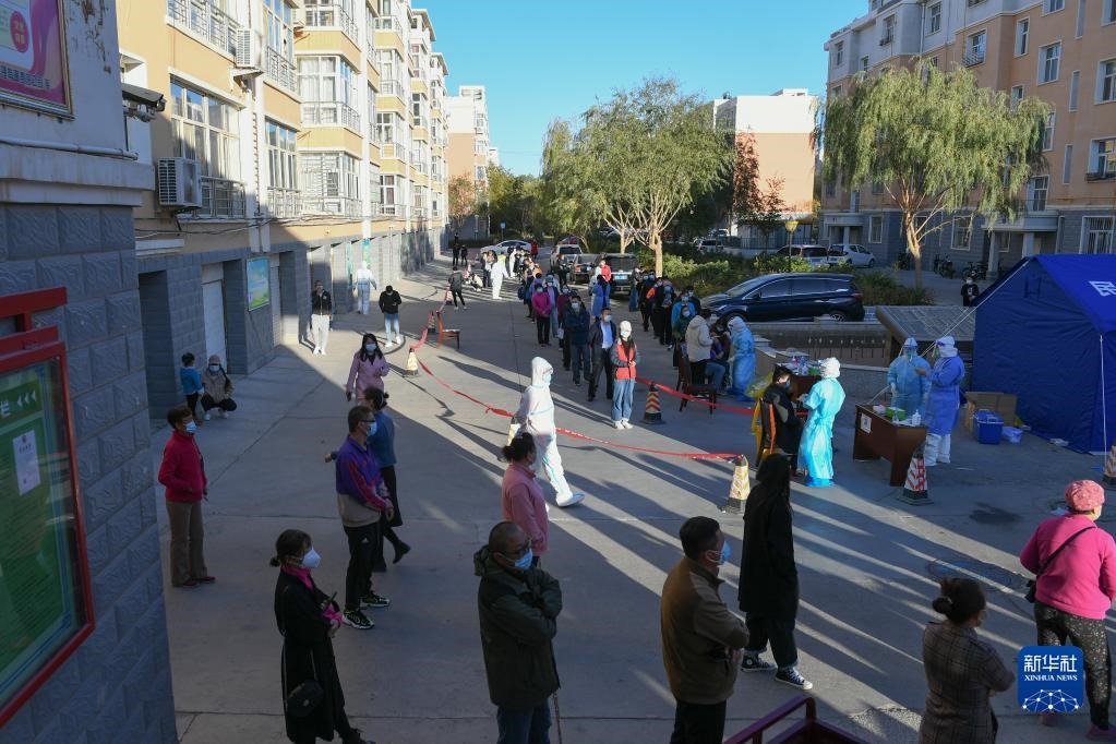 10月20日,在因疫情封控的阿拉善盟額濟(jì)納旗達(dá)來(lái)呼布鎮(zhèn)天賦佳苑小區(qū)內(nèi),核酸采樣工作有序開(kāi)展。新華社記者 貝赫 攝