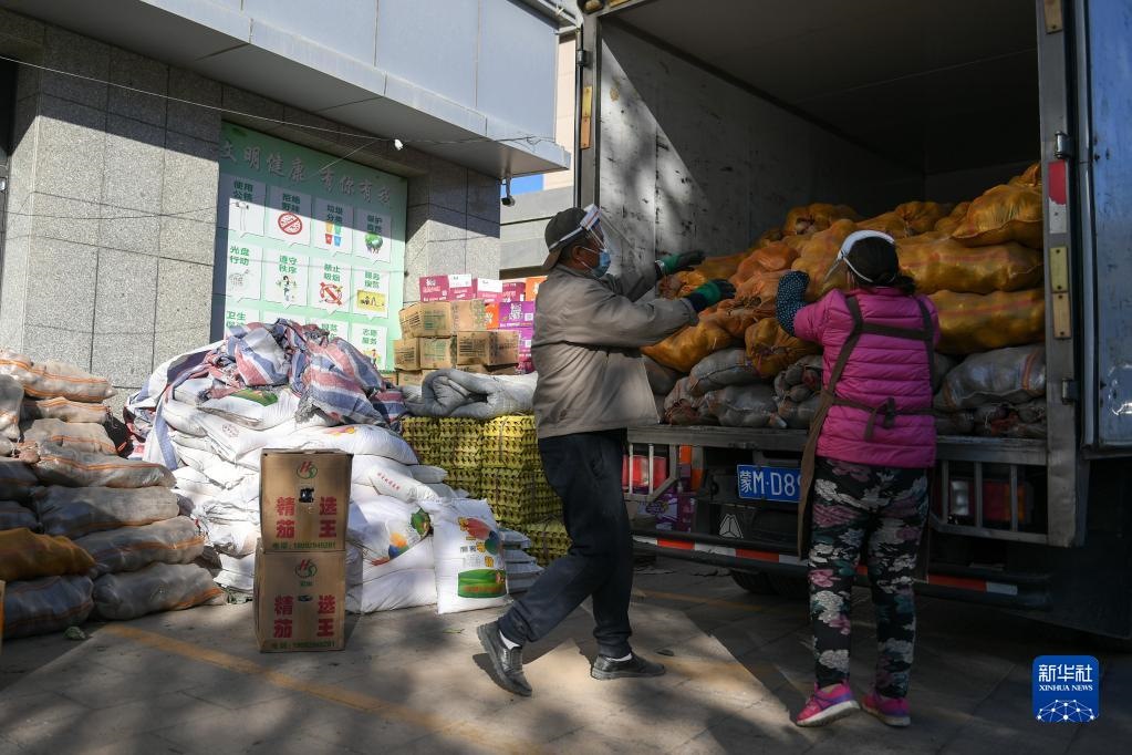 10月20日,在阿拉善盟額濟(jì)納旗達(dá)來(lái)呼布鎮(zhèn)民族生活超市外,超市員工在搬運(yùn)物資。新華社記者 貝赫 攝