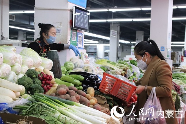 走進(jìn)呼和浩特市美通農(nóng)批市場(chǎng),每個(gè)攤位前商品豐富多樣,糧、油、肉、蛋、水果等生活必需品貨源充足。在蔬菜區(qū),市民們正在挑選蔬菜,茄子、生菜、白菜等蔬菜。
