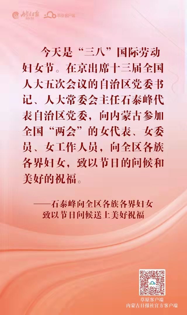 今天是“三八”國際勞動婦女節(jié)。在京出席十三屆全國人大五次會議的自治區(qū)黨委書記、人大常委會主任石泰峰代表自治區(qū)黨委,向內蒙古參加全國“兩會”的女代表、女委員、女工作人員,向全區(qū)各族各界婦女,致以節(jié)日的問候和美好的祝福。(內蒙古日報社融媒體記者 章奎)