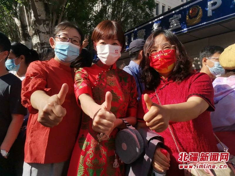 呼和浩特市第二中學(xué)和呼和浩特市土默特中學(xué)送考教師身著旗袍,祝愿孩子們“旗開(kāi)得勝”。