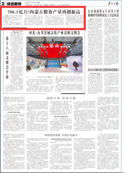 12月29日,《農(nóng)民日報(bào)》2版刊發(fā)《780.1億斤!內(nèi)蒙古糧食產(chǎn)量再創(chuàng)新高》,報(bào)道2022年內(nèi)蒙古糧食產(chǎn)量實(shí)現(xiàn)“十九連豐”,再創(chuàng)新高!