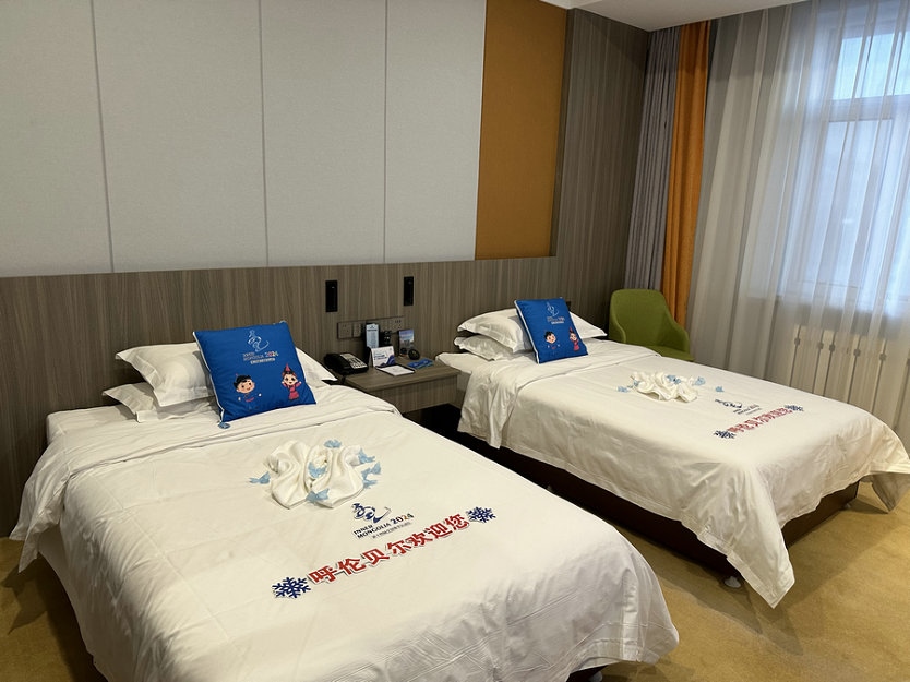 當記者走進酒店房間時,“十四冬”的吉祥物抱枕擺在床頭,床上用毛巾和花朵擺的雪花造型以及“呼倫貝爾歡迎您”的暖心話語,瞬間趕走一路疲憊。
