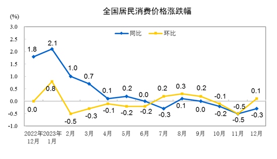 2023年12月份,全國居民消費價格同比下降0.3%。其中,城市下降0.3%,農(nóng)村下降0.5%;食品價格下降3.7%,非食品價格上漲0.5%;消費品價格下降1.1%,服務價格上漲1.0%。