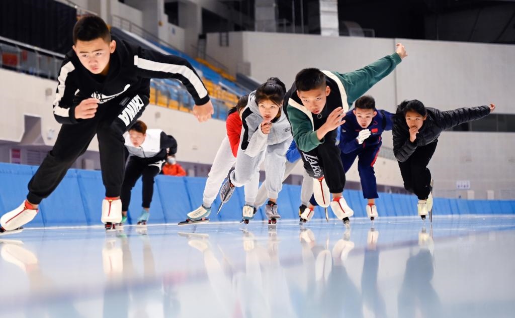 ??呼倫貝爾學(xué)院冰雪運動專業(yè)學(xué)生正在進(jìn)行滑冰訓(xùn)練。新華社記者 賀書琛 攝