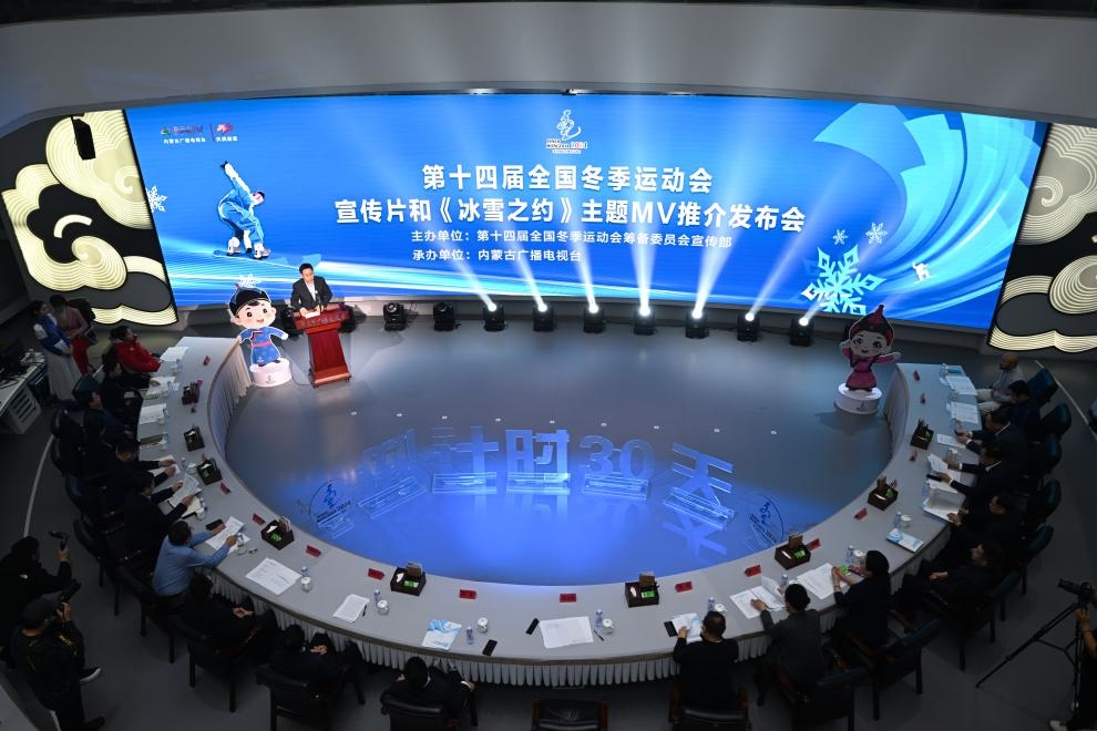 ??這是1月17日拍攝的第十四屆全國冬季運動會宣傳片和《冰雪之約》主題MV推介發(fā)布會現(xiàn)場。新華社記者 貝赫 攝