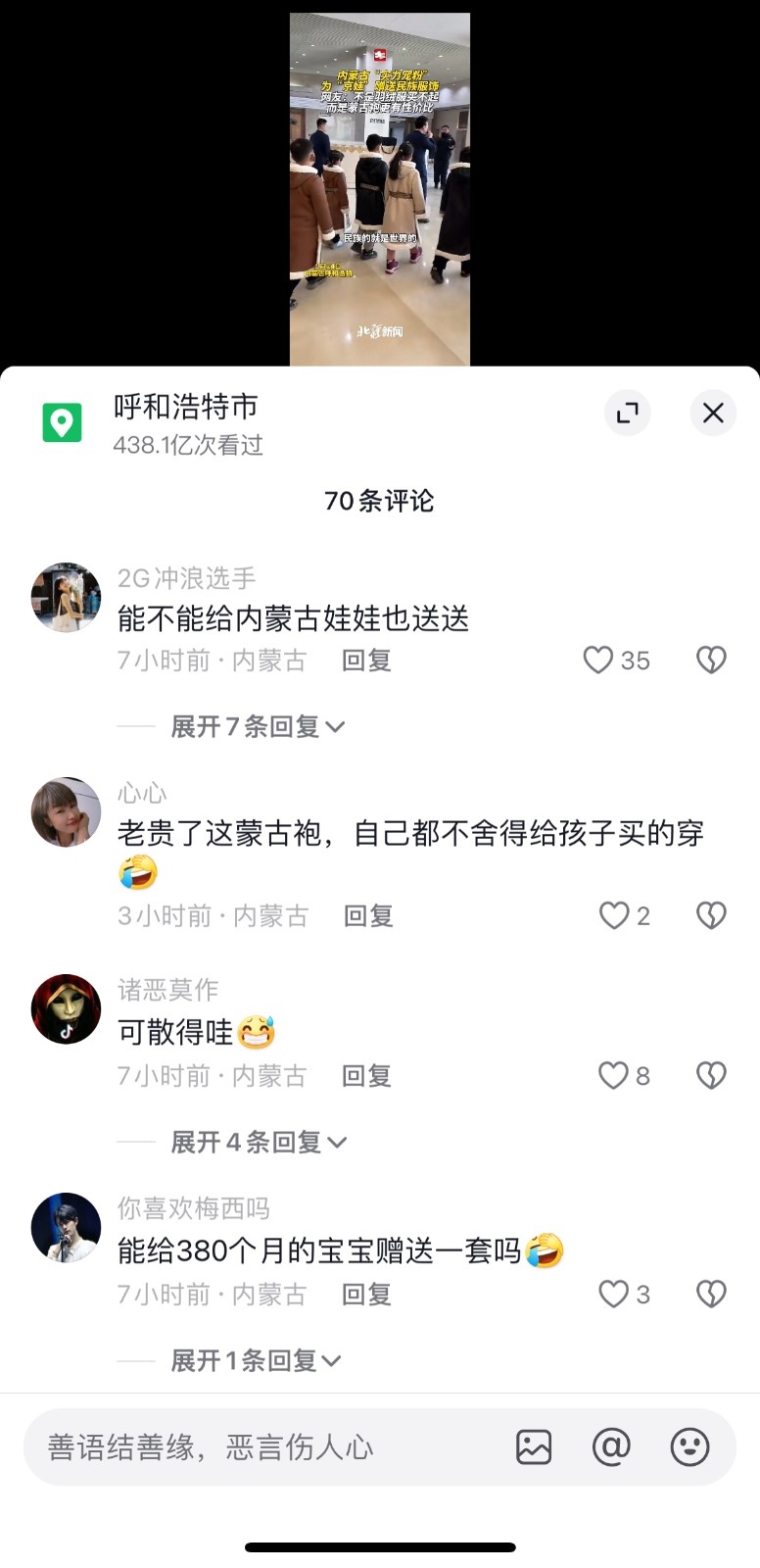 內(nèi)蒙古為了招待北京來的萌娃們,直接送了溫暖的蒙古袍,對于這些,本地人的反應是:“能不能給內(nèi)蒙古娃娃也送送”“能給380個月的寶寶贈送一套嗎”。還有本地人表示,“蒙古袍子就送了”“老貴了這蒙古袍,自己都不舍得給孩子買的穿”。