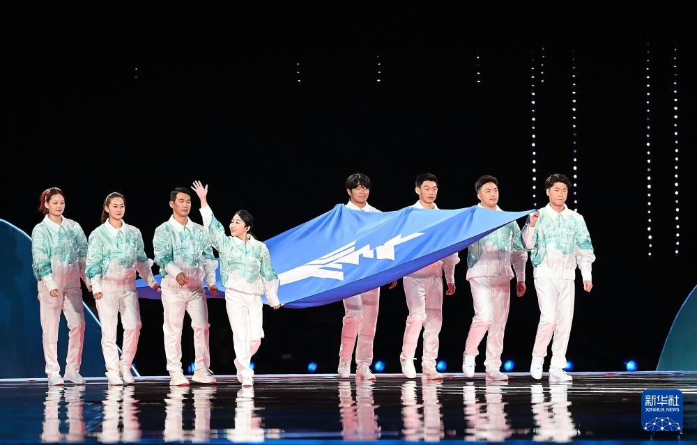 ??2月17日,中華人民共和國第十四屆冬季運(yùn)動會會旗在開幕式上入場。新華社記者 黃偉 攝