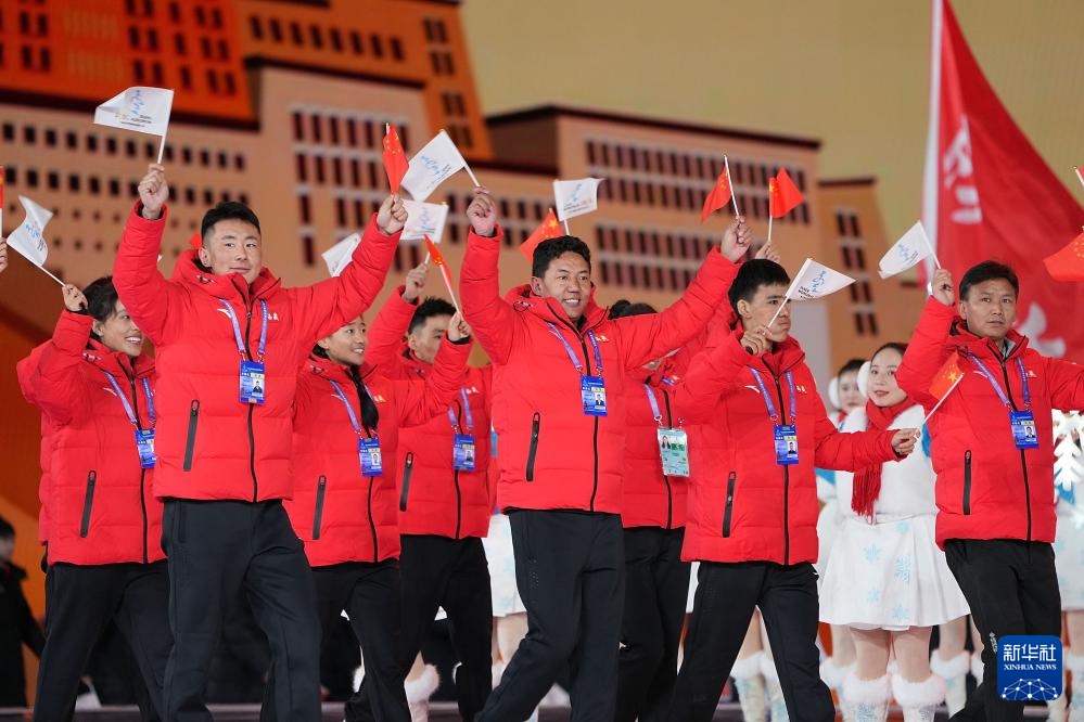 ??2月17日,新疆生產(chǎn)建設(shè)兵團(tuán)體育代表團(tuán)在開幕式上入場。新華社記者 李博 攝