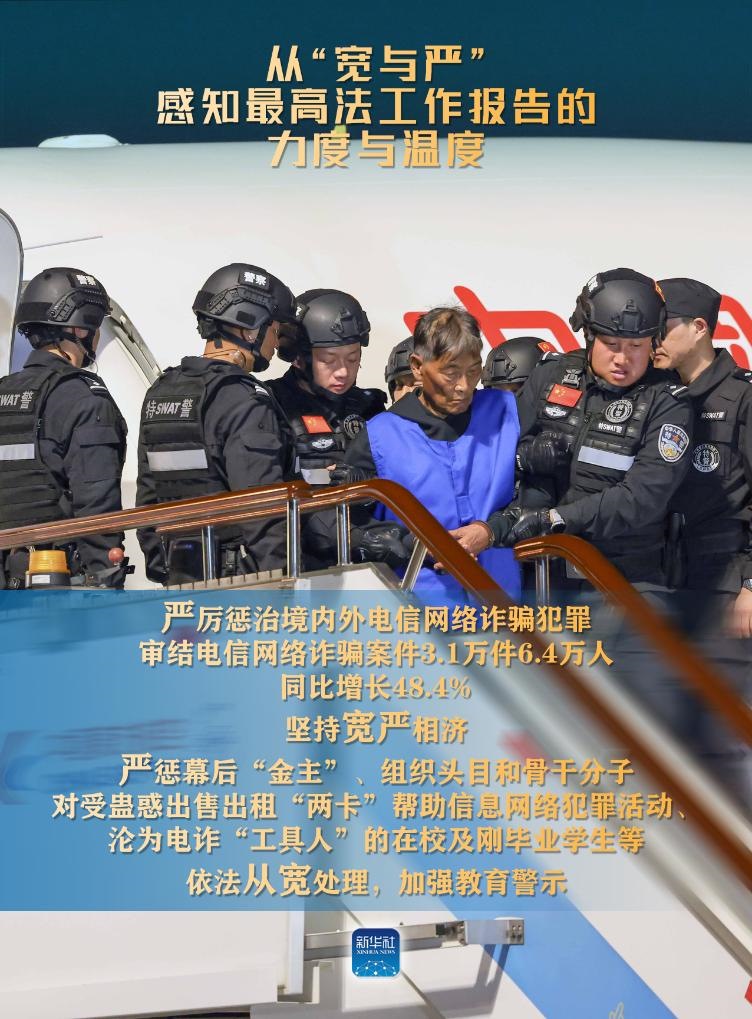 新華社北京3月9日電(記者高潔、馬知遙、袁秋岳)3月8日,最高人民法院工作報(bào)告提請(qǐng)十四屆全國(guó)人大二次會(huì)議審議。報(bào)告中列舉了不少案例,有的案件從嚴(yán)從重判決,有的從寬或無(wú)罪判決。讓我們從“寬與嚴(yán)”感知報(bào)告的力度與溫度。