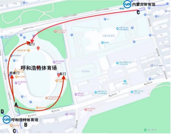 由呼和浩特體育場站A口、D口出站,沿氣象局西路向北直行可抵達呼和浩特體育場西門安檢處。