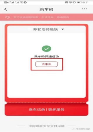 開通成功后,點擊“去乘車”獲取乘車二維碼,在進、出閘機對應(yīng)區(qū)域掃描二維碼即可。