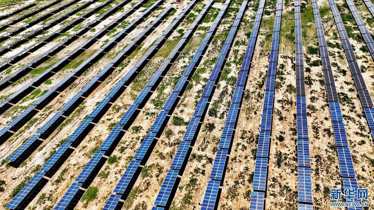 ??6月14日,在地處科爾沁沙地邊緣的翁牛特旗其甘地區(qū)拍攝的光伏發(fā)電場。新華網(wǎng)發(fā)(李富 攝)