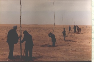 ??“領(lǐng)導(dǎo)都帶頭干,王占文書記包的我們奮勇大隊(duì),帶我們種沙柳。全大隊(duì)11個(gè)生產(chǎn)隊(duì),排著隊(duì)、唱著歌,把紅旗插在各自的沙梁上。民兵也領(lǐng)著娃娃們來種樹,他們掏坑,娃娃遞樹栽子。幾年下來,把奮勇大隊(duì)種成了自治區(qū)最早的萬畝林大隊(duì)。馮耀華當(dāng)時(shí)是公社副書記,包的是阿魯柴登,郭巨才當(dāng)時(shí)是公社副主任,包了什里加汗。王占文還專門組織了測(cè)繪隊(duì),繪出地圖,統(tǒng)一規(guī)劃,給所有農(nóng)田種上防護(hù)林,定下在哪修路種上行道樹。20年后按圖修路時(shí),施工隊(duì)發(fā)現(xiàn),路基兩旁的樹早種好了。”白三寶回憶。