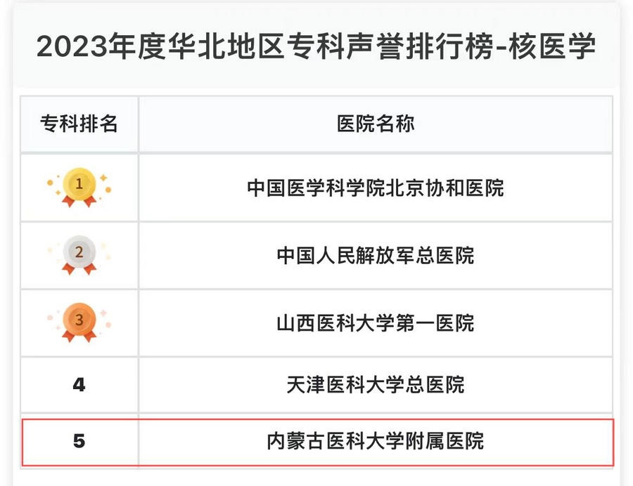 內蒙古醫(yī)科大學附屬醫(yī)院核醫(yī)學科位列華北區(qū)第五,神經外科、婦產科、風濕科、重癥醫(yī)學、眼科、消化科、生殖醫(yī)學、腎臟病、皮膚科、內分泌科、麻醉科、老年醫(yī)學、口腔科、檢驗醫(yī)學、急診醫(yī)學、變態(tài)反應、疼痛學、罕見病、耳鼻喉科、健康管理、血液科、整形外科等22個專科獲提名,是內蒙古自治區(qū)在此榜單獲前五和提名??谱疃嗟尼t(yī)院。