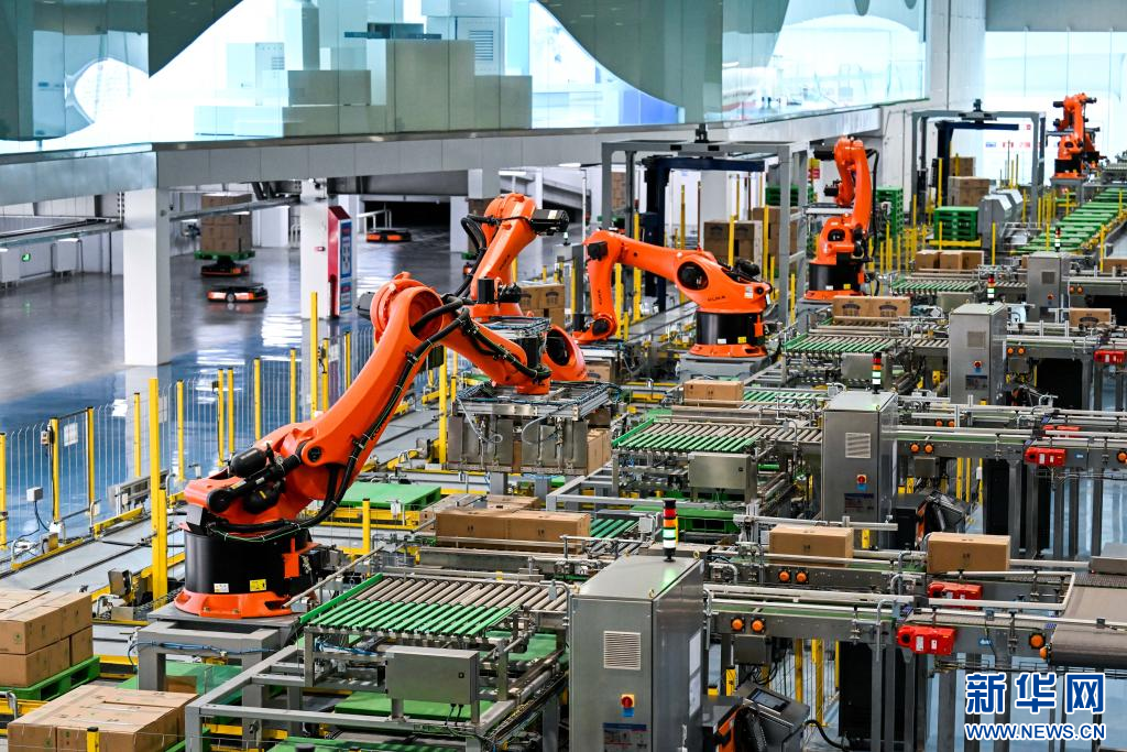 1月9日,在呼和浩特市伊利現(xiàn)代智慧健康谷液態(tài)奶全球智造標桿基地,機械臂在碼放裝箱的奶制品。