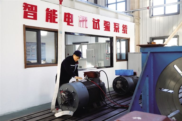 內(nèi)蒙古優(yōu)普森電氣有限公司生產(chǎn)車間內(nèi)一臺(tái)永磁電機(jī)正在進(jìn)行出廠前試驗(yàn)。 記者 劉向平 攝