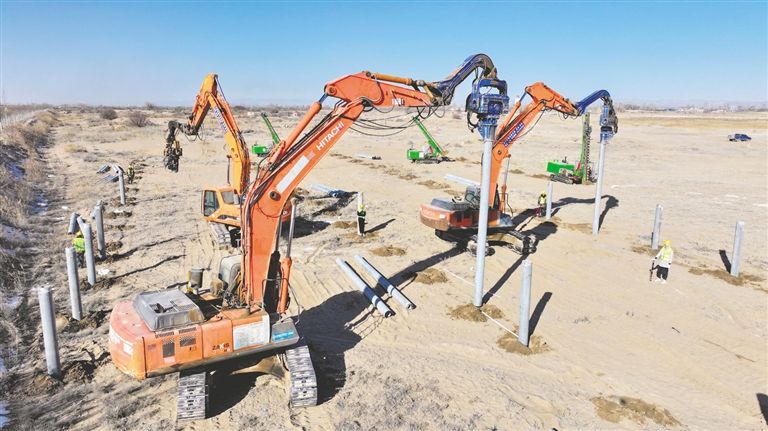 引孔機(jī)、打樁機(jī)轟鳴聲不絕于耳,打樁機(jī)將一根根水泥樁“釘”入地面中……連日來,巴彥淖爾市臨河區(qū)新華林場防沙治沙和光伏一體化項(xiàng)目施工現(xiàn)場多臺(tái)作業(yè)車輛同時(shí)進(jìn)行樁基作業(yè),現(xiàn)場還不時(shí)有工作人員對(duì)打樁等基礎(chǔ)工作進(jìn)行抽檢抽查,確保施工質(zhì)量。