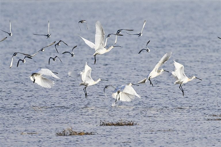 包頭市土右旗黃河濕地,鵜鶘、鳳頭鸊鷉、白鷺、紅嘴鷗等眾多候鳥正在覓食游弋飛翔棲息。本報(bào)記者 王曉博 攝