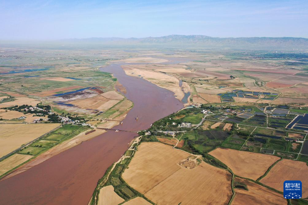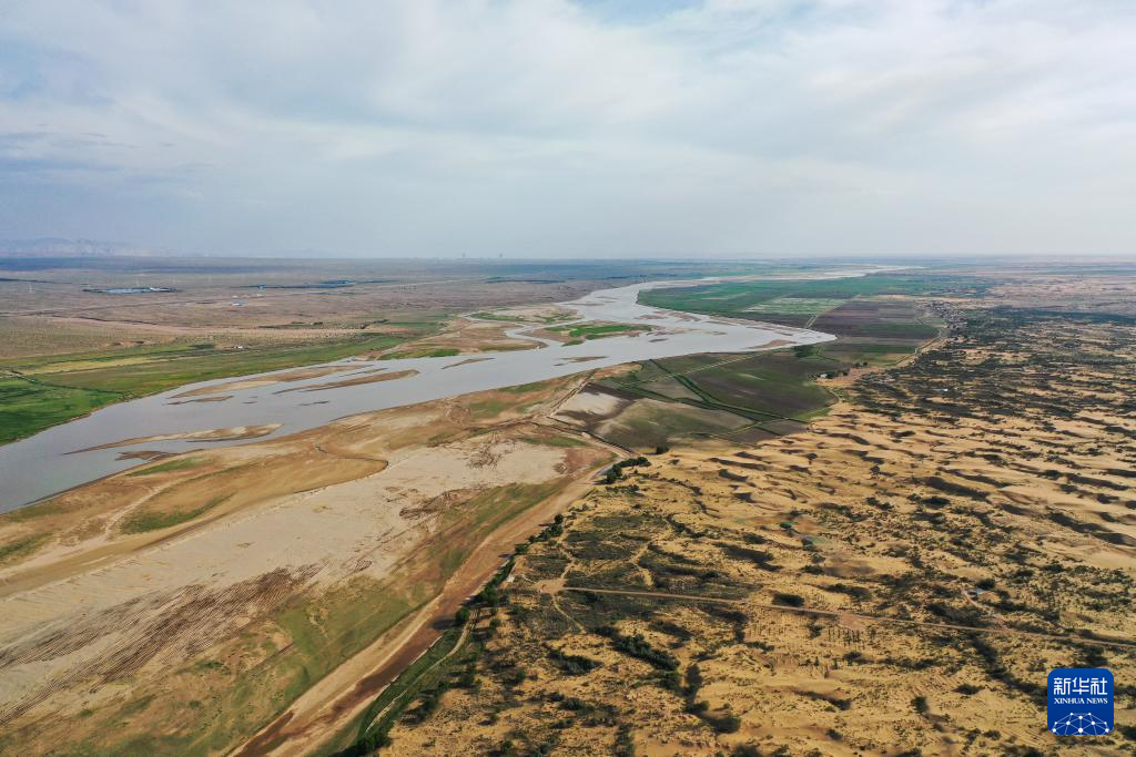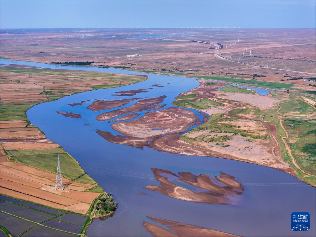在巴彥淖爾市磴口縣劉拐沙頭,黃河蜿蜒而過(guò)(6月5日攝,無(wú)人機(jī)照片)新華社記者 連振 攝