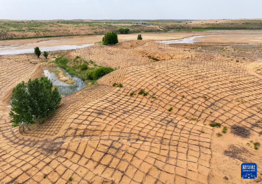 6月7日,在鄂爾多斯市達(dá)拉特旗境內(nèi)的庫(kù)布其沙漠,工人在治沙(無(wú)人機(jī)照片)新華社記者 李志鵬 攝