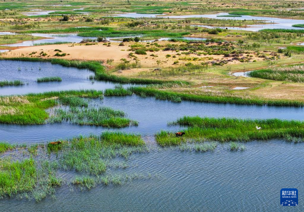 這是位于巴彥淖爾市磴口縣的奈倫湖國(guó)家濕地公園(6月5日攝,無(wú)人機(jī)照片)新華社記者 連振 攝