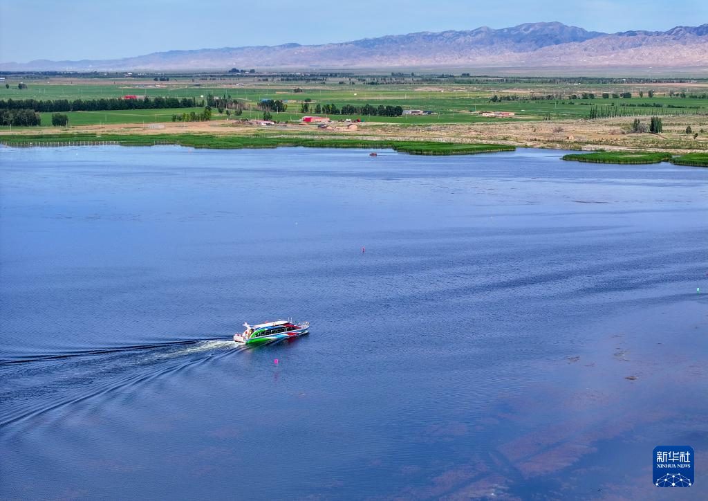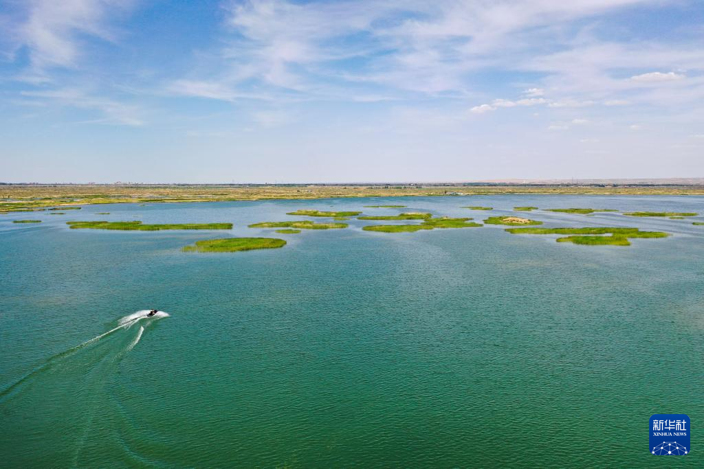 6月5日,在巴彥淖爾市磴口縣奈倫湖國(guó)家濕地公園,摩托艇行駛在湖面上(無(wú)人機(jī)照片)新華社記者 李志鵬 攝
