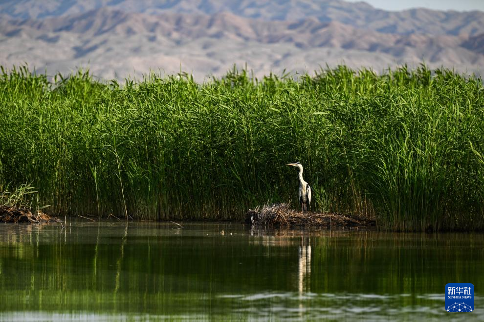 6月4日,一只蒼鷺在烏梁素海蘆葦叢中覓食 新華社記者 連振 攝