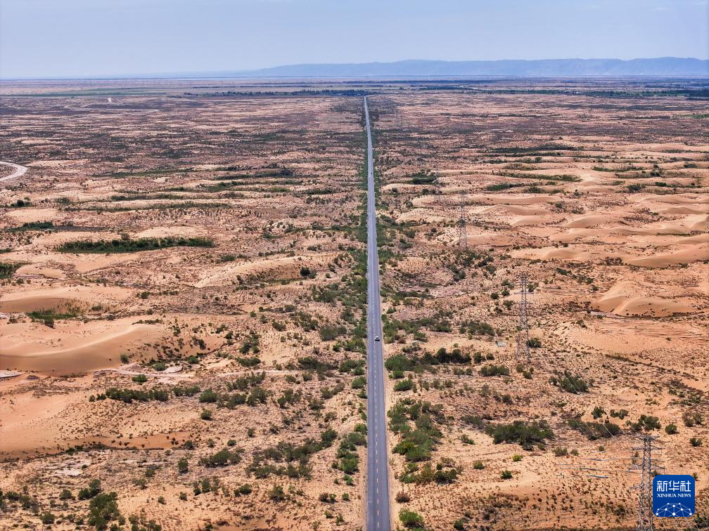 在巴彥淖爾市磴口縣,公路穿越烏蘭布和沙漠(6月5日攝,無(wú)人機(jī)照片)新華社記者 連振 攝