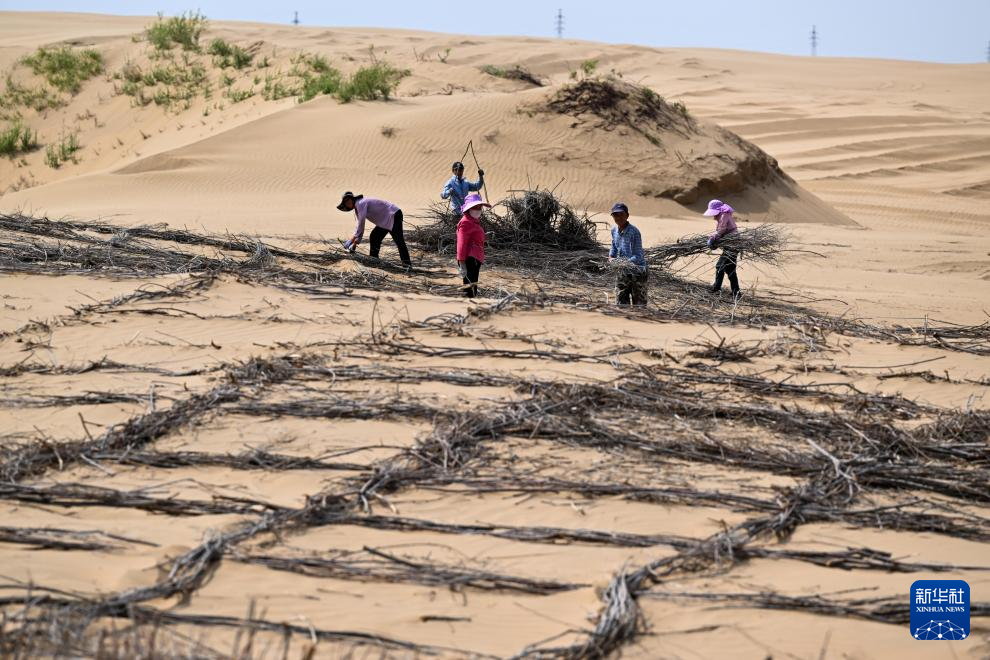 6月7日,在鄂爾多斯市達(dá)拉特旗境內(nèi)的庫(kù)布其沙漠,工人在治沙 新華社記者 李志鵬 攝