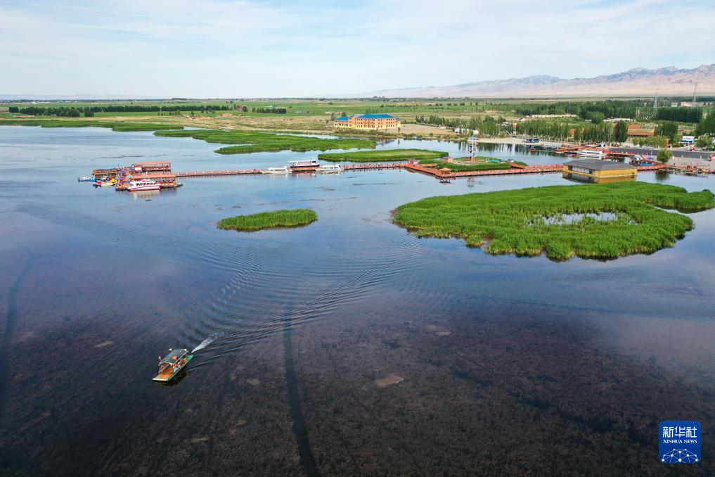 6月4日,游船行駛在烏拉特前旗烏梁素海湖面上(無(wú)人機(jī)照片)新華社記者 連振 攝