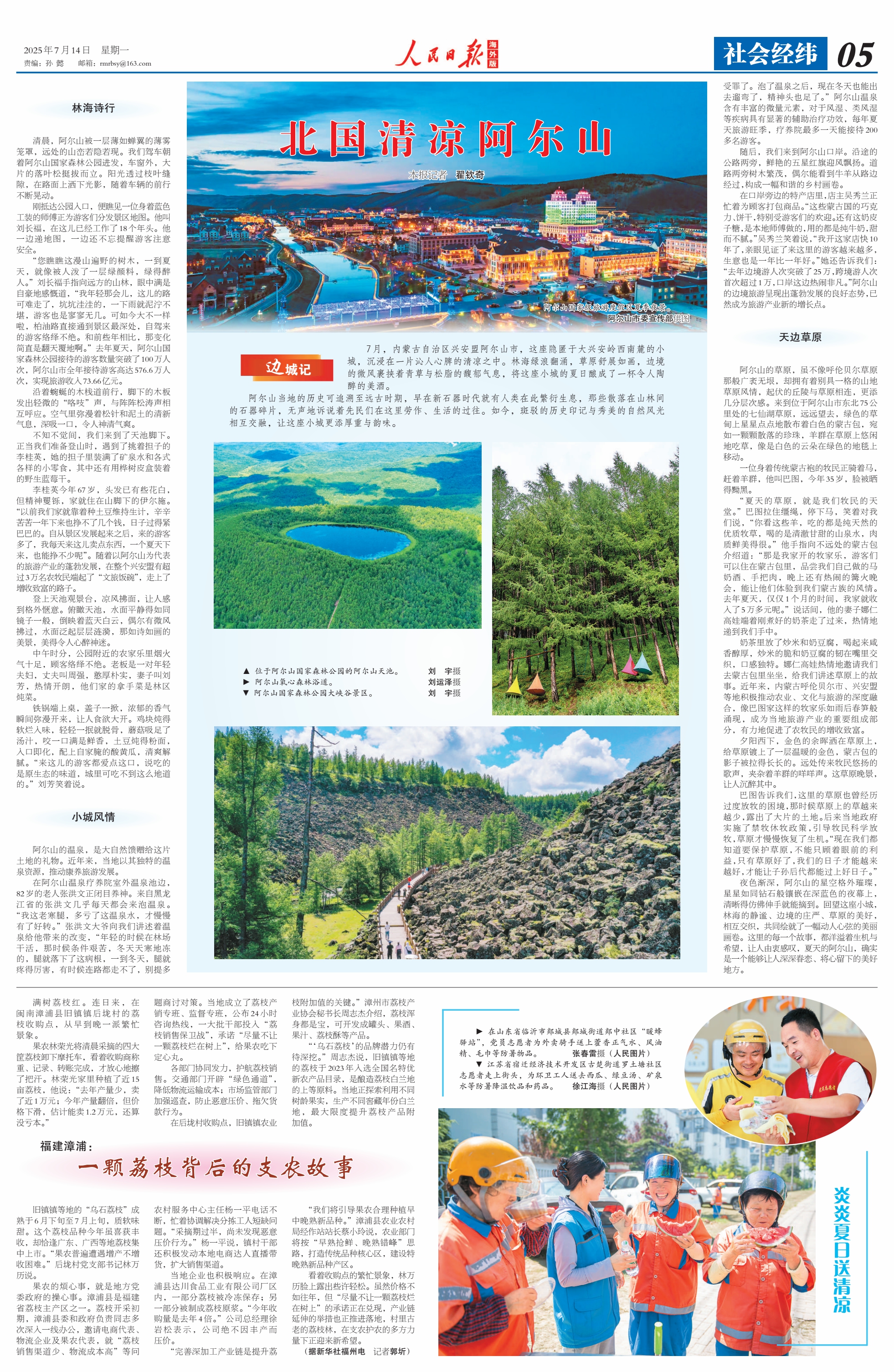 2025年7月14日《人民日報(bào)海外版》第5版刊發(fā)了題為《北國清涼阿爾山》的文章,報(bào)道了7月,內(nèi)蒙古自治區(qū)興安盟阿爾山市,這座隱匿于大興安嶺西南麓的小城,沉浸在一片沁人心脾的清涼之中。林海綠浪翻涌,草原舒展如畫,邊境的微風(fēng)裹挾著青草與松脂的馥郁氣息,將這座小城的夏日釀成了一杯令人陶醉的美酒。