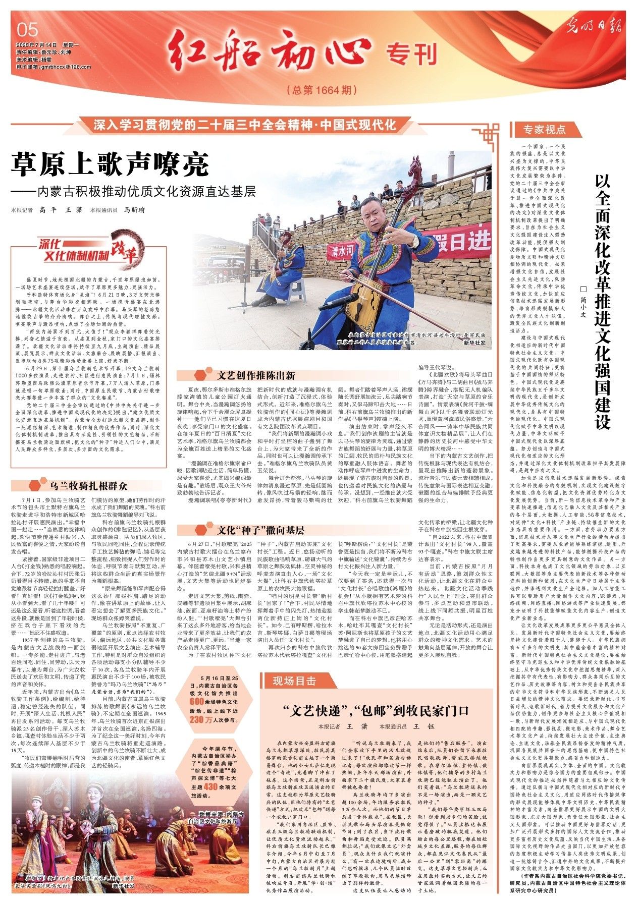 2025年7月14日,《光明日報》第5版刊發(fā)題為《草原上歌聲嘹亮——內(nèi)蒙古積極推動優(yōu)質(zhì)文化資源直達(dá)基層》的文章,報道了盛夏時節(jié),地處祖國北疆的內(nèi)蒙古,千里草原綠浪如茵。一場場藝術(shù)盛宴連續(xù)登場,賦予了草原更多魅力、更強(qiáng)活力。