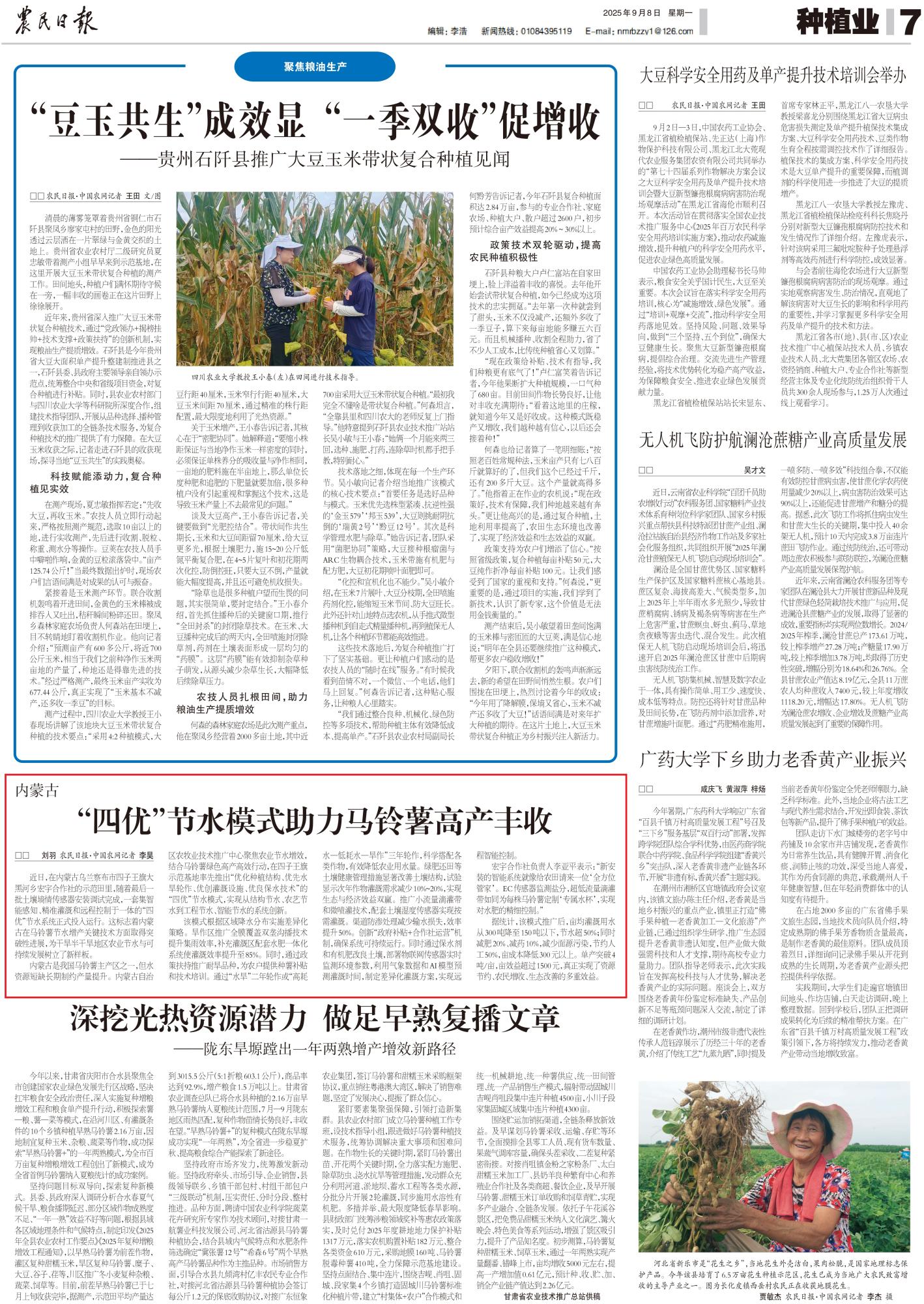 2025年9月8日,《農(nóng)民日報》第7版整版刊發(fā)題為《內(nèi)蒙古“四優(yōu)”節(jié)水模式助力馬鈴薯高產(chǎn)豐收》的文章,報道了在內(nèi)蒙古烏蘭察布市四子王旗大黑河鄉(xiāng)宏宇合作社的示范田里,隨著最后一批土壤墑情傳感器安裝調(diào)試完成,一套集智能感知、精準(zhǔn)灌溉和遠程控制于一體的“四優(yōu)”節(jié)水系統(tǒng)正式投入運行。這標(biāo)志著內(nèi)蒙古在馬鈴薯節(jié)水增產(chǎn)關(guān)鍵技術(shù)方面取得突破性進展,為干旱半干旱地區(qū)農(nóng)業(yè)節(jié)水與可持續(xù)發(fā)展樹立了新樣板。